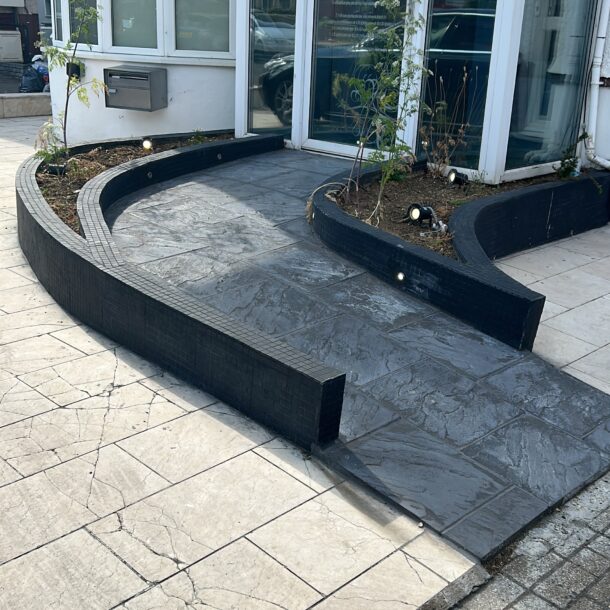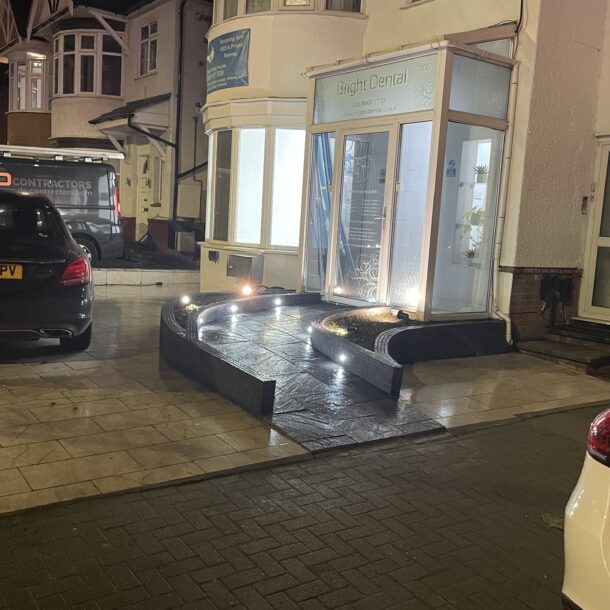 We created a paved ramp for a dental practice in Harrow, providing accessibility for wheelchair users and patients with strollers and mobility challenges. We evaluated the site to determine the optional slope and design for the ramp, and we ensured it meets local building codes and regulations. Special consideration was given to proper drainage around the ramp to eliminate slip hazard for patients and prevent water accumulation and potential damage. Outdoor lighting was installed along the ramp for visibility and safety in the evenings and in winter time. The result is a functional and attractive ramp, which enhances the accessibility as well as curb appeal.