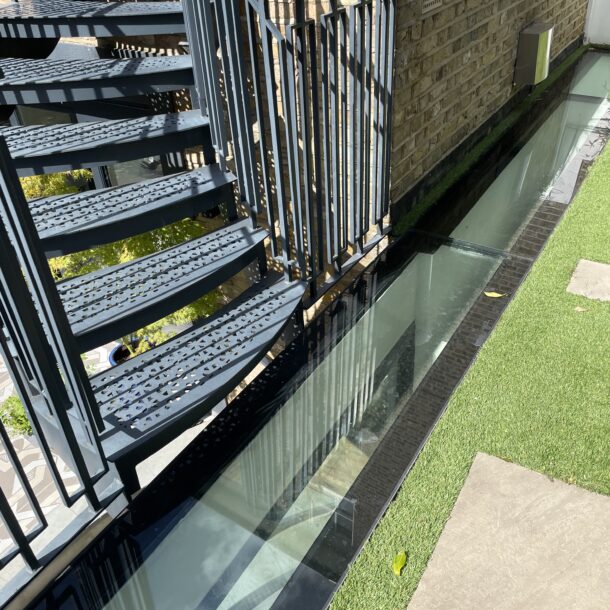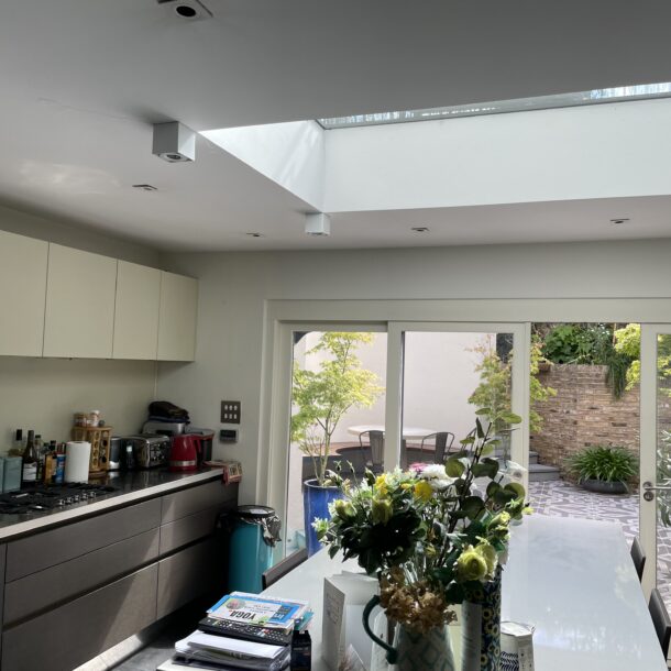 We worked with our client in Pimlico to create a beautiful and functional patio and rooftop retreat that enhances their lifestyle and adds value to their property. We transformed their ground floor outdoor space into an elegant patio to make it a focal point for gatherings and an inviting space for alfresco dining. Patterned tiles offer a sleek and contemporary look while planters with tall plants add greenery and create a lush, relaxing environment. A round garden bench is a beautiful and functional addition to the outdoor space, which provides a cosy seating area and offers aesthetic benefits. The kitchen rooftop is low maintenance and practical thanks to artificial grass and stone tiles. It now provides an elevated and secluded outdoor space, offering a tranquil escape from the hustle and bustle of daily life.